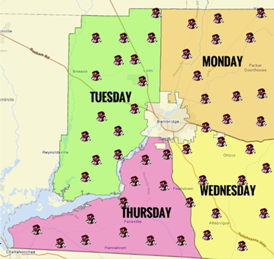 Trash is collected once per week. Decatur is divided into four quadrants, with service days running Monday through Thursday. Friday is reserved as a make-up day.